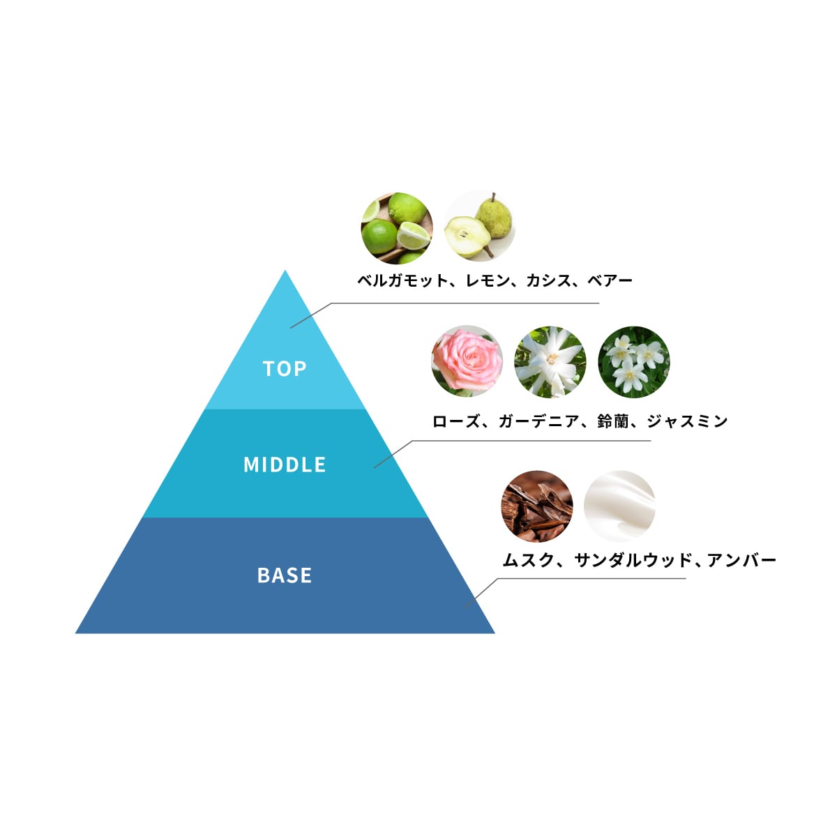時間がたつほど、ムスクとやわらかなウッディが静かに重なり、甘さを上品にほどきながら、心までゆるむアロマティック・ホワイトフローラルブーケへ。