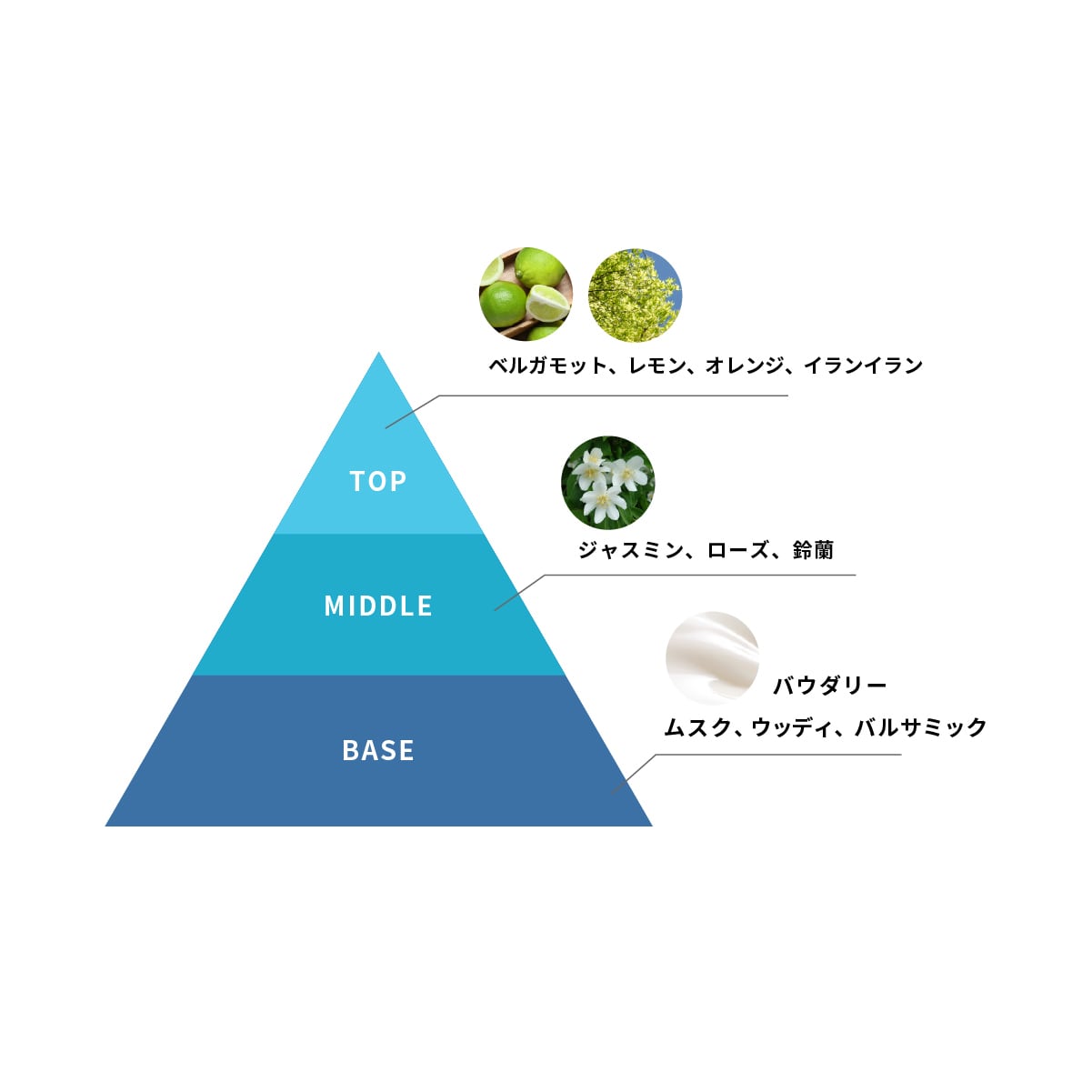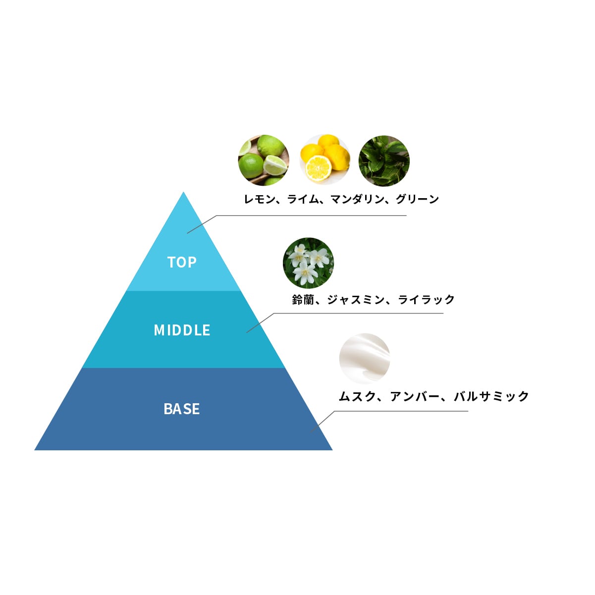 爽やかな空気と、洗い立てのコットンを想わせる、優しくてフレッシュなシトラス・グリーン・フローラルの香り。